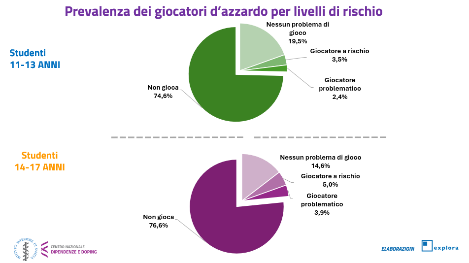 La ricerca ha confermato nella popolazione 14-17 anni una prevalenza di giocatori d’azzardo pari al 23,4% (erano il 24,6% nel 2024) con una prevalenza del 3,9% di giocatori problematici ma ha evidenziato la precocità dei comportamenti di gioco: infatti, tra gli studenti 11-13 la prevalenza di giocatori d’azzardo è del 25,4%, con il 2,4% di prevalenza di giocatori problematici.