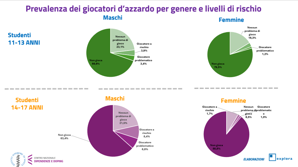 Anche la prevalenza dei giocatori problematici è più alta tra i maschi: è il 3,4% nella fascia 11-13 anni (vs F 1,2%) e il 6,6% nella fascia 14-17 (vs F 1,0%).