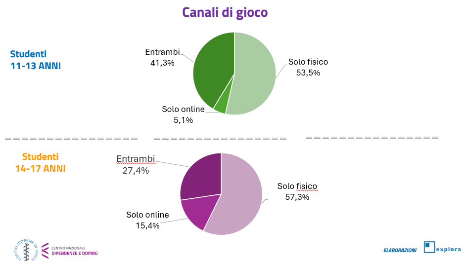 Rispetto ai canali di gioco, per entrambe le popolazioni oltre la metà degli studenti pratica esclusivamente gioco d’azzardo in luogo fisico. Già tra i giocatori d’azzardo della fascia d’età 11-13 anni si osserva la pratica del gioco d’azzardo on line nel 46,4% (esclusivo 5,1%; in associazione con il gioco in luogo fisico 41,3%). Tra i giocatori d’azzardo della fascia d’età 14-17 anni la pratica del gioco d’azzardo on line è il 42,8% (esclusivo 15,4%; in associazione con il gioco in luogo fisico 27,4%).